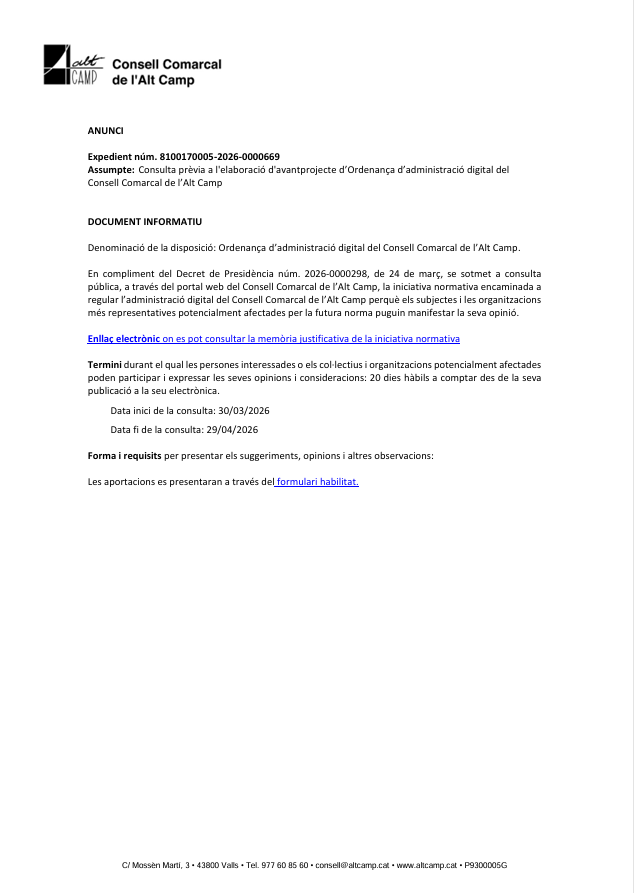 El Consell Comarcal de l’Alt Camp obre un període de consulta pública prèvia en relació amb l’elaboració de l’avantprojecte de l’Ordenança d’administració digital.