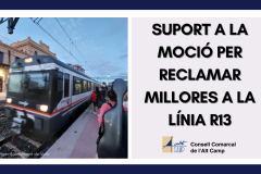 El Consell Comarcal de l’Alt Camp donarà suport a la moció per reclamar millores urgents al servei ferroviari de la línia R13